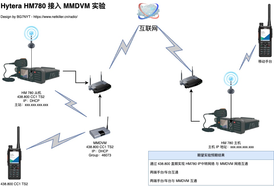 实验把本地从机与远程主机互联,本地电台与 MMDVM 设置相同频率,色码,时隙,通话组,你可以理解为,HM780 就是用个用户手持电台的场景。
